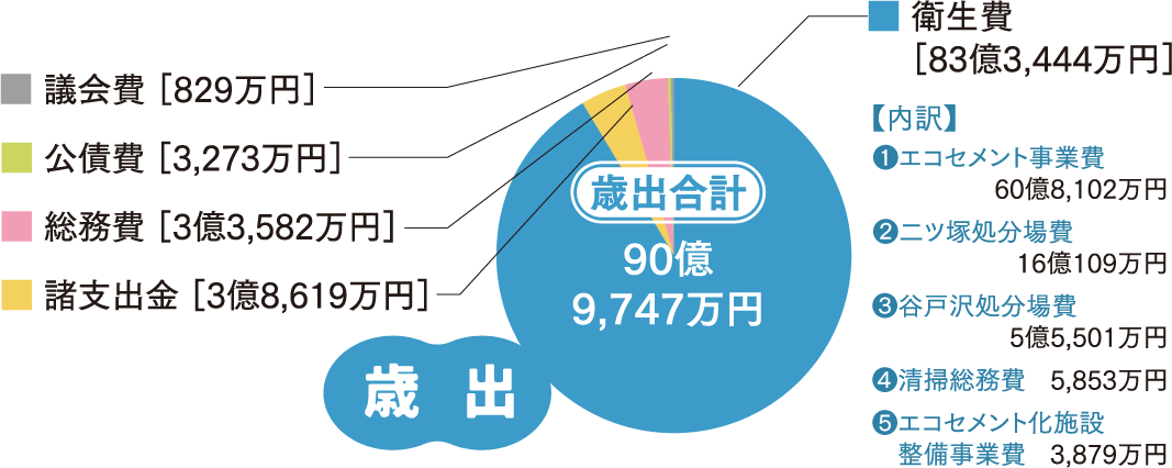歳出の主なものは、エコセメント事業に関する経費ですが、原材料費高騰により前年度と比較して約2億5千万円の増額となっています。